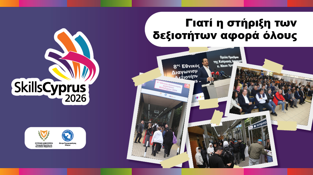 Tο Κέντρο Παραγωγικότητας, του Υπουργείου Εργασίας και Κοινωνικών Ασφαλίσεων, ανακοινώνει την προκήρυξη του 9ου Εθνικού Διαγωνισμού Δεξιοτήτων SkillsCyprus 2026, ο οποίος έχει τεθεί υπό την αιγίδα του Προέδρου της Κυπριακής Δημοκρατίας κ. Νίκου Χριστοδουλίδη. Ο Διαγωνισμός αποτελεί τη μεγαλύτερη γιορτή δεξιοτήτων στην Κύπρο και μια εξαιρετική ευκαιρία για τους νέους